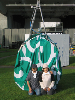 北海道デザイン協議会のイベントに参加した時の作品です。ニセコ東山で長い間役目を果たしたゴンドラが山から降りてきて、デザイン協議会のデザイナーの面々が様々な発想を展開し楽しいイベントでした。私は、大きな唐草模様の風呂敷でゴンドラを包んでしまいました。文字通り大風呂敷を広げてゴンドラを包んでしまうと、宝物が入っている、金製のゴンドラなのなどどんなホラも吹けそう!